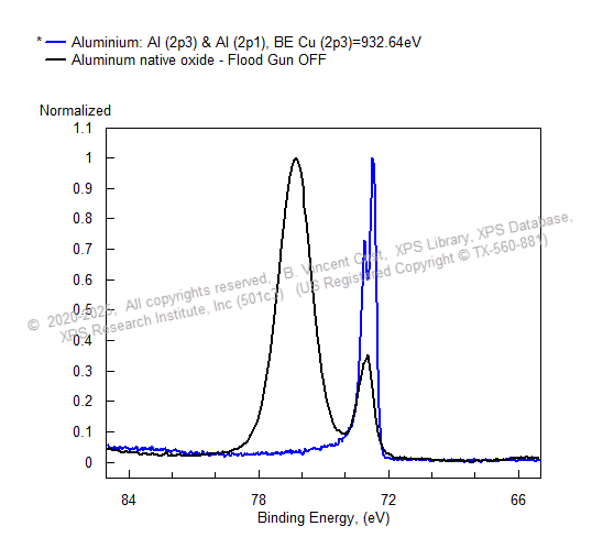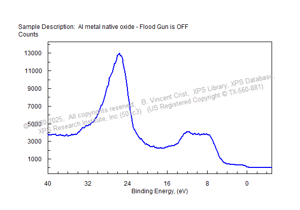 | Conductivity: | Metal form is very conductive Aluminum Resistivity = 26.5 nΩ⋅m (at 20 °C) Al2O3 Resistivity = 1×1014 Ω ·cm Flood gun on Native oxide causes differential charging |