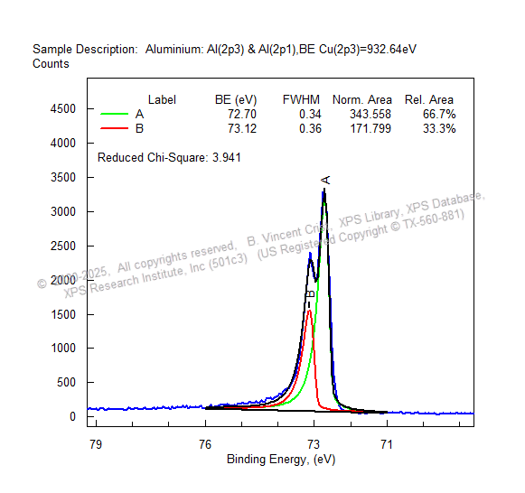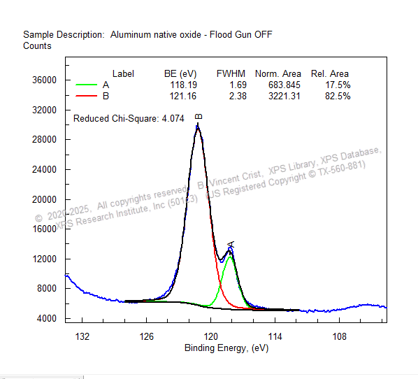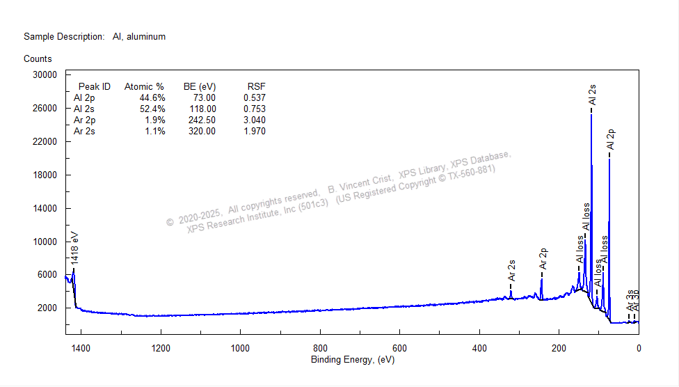 - FWHM (eV) of Al (2p3/2) from Pure Aluminum metal: ~0.35 eV using 25 eV Pass Energy after ion etching and very fast data collection cycles